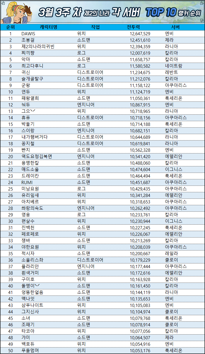 - 집계는 15일 14시부터 약 1시간 동안 실시됐으며, 누적 랭킹 메뉴의 캐릭터 전체 랭킹 항목을 기준으로 각 서버 상위 10명까지 선별했습니다. 집계 시간 동안 랭커들의 활동에 따라 전투력 및 직업에 오차가 발생할 수 있습니다.