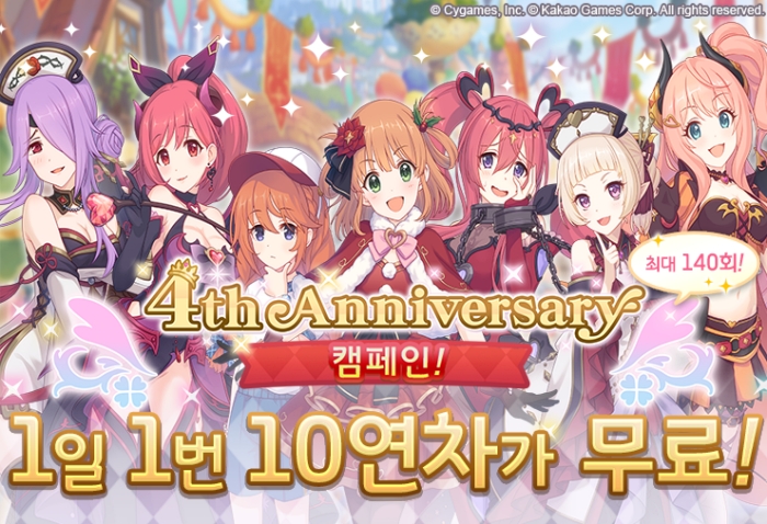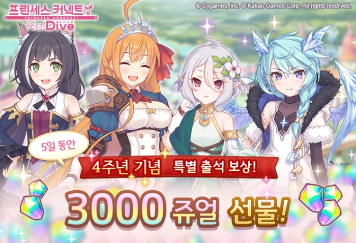 ‘프린세스 커넥트! Re:Dive’의 서비스 4주년 기념 이벤트도 마련됐다. 5월 1일까지 '4주년 무료 140회 연차' 이벤트를 통해 게임에 접속하는 이용자에게 무료 캐릭터 10회 연차를 최대 140회까지 제공하고, 3월 20일까지는 ‘4주년 기념 특별 출석 보상’으로 인게임 재화인 ‘쥬얼’ 총 3,000개를 획득 가능하다. 아울러 3월 30일까지 ‘4주년 스페셜 로그인 보너스 랜드솔배 달리기’를 열어 이용자가 선택한 캐릭터의 레이스 등수에 따라 ‘쥬얼’을 지급한다.
