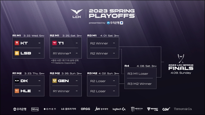 플레이오프 1라운드 KT 롤스터와 리브 샌드박스의 대결은 3월 22일(수) 오후 5시에 서울 종로구 롤파크에 위치한 LCK 아레나에서 열리며 23일(목) 오후 5시에는 디플러스 기아와 한화생명e스포츠의 대결이 펼쳐진다.