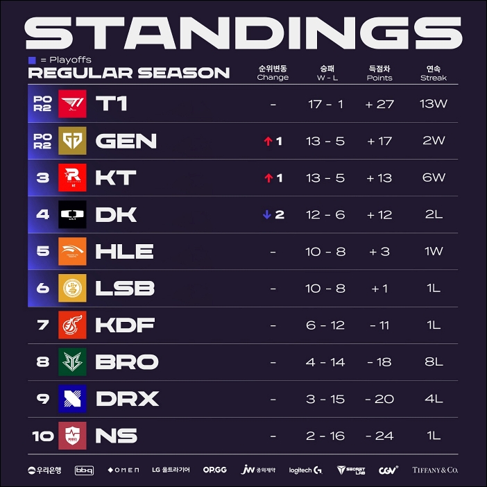 7주 차부터 이어온 연승 행진을 9주 차에도 이어간 KT 롤스터는 13승5패로 젠지와 승패가 같았지만 세트 득실에서 뒤처지면서 정규 리그를 3위로 마무리했다. 5위 한화생명e스포츠와 6위 리브 샌드박스 가운데 한 팀을 선택할 수 있는 지명권을 가져간 KT 롤스터의 선택은 리브 샌드박스였다. KT 롤스터가 리브 샌드박스를 택하면서 정규 리그 4위인 디플러스 기아의 상대는 한화생명e 스포츠로 정해졌다.