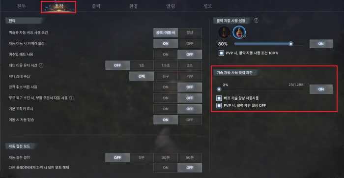 버프 기술 사용을 위해 최저 활력도 설정하자. 최저 활력 설정은 설정 메뉴 조작 탭에서 가능하며, '기술 자동 사용 활력 제한'을 ON으로 바꾼 뒤 자신이 사용하는 버프 기술 항상 자동 사용을 체크하면 활력 낭비를 막고, 버프 기술을 항상 유지할 수 있다.