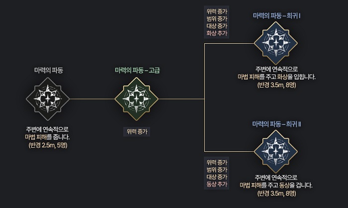 다음으로 커스터마이징 성장에서는 특정 등급 아퀴룬을 장착할 경우에 2종의 스킬 형태 중 하나를 선택할 수 있는 형태다. 가령 주문각인사의 기본 스탠스 스킬인 '마력의 파동'은 희귀 등급 아퀴룬을 장착해 '마력의 파동-희귀I' 혹은 '마력의 파동-희귀ll' 중에서 유저가 원하는 형태로 성장시키는 것이 가능하며 희귀l은 '화상' 효과를, 그리고 희귀ll는 '동상' 효과를 부여할 수 있다.