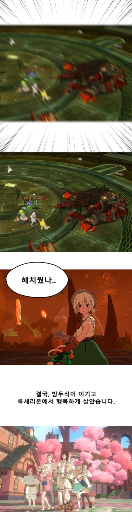 방두식: 결말을 만화로 또 만들어봤습니다! 재밌게 봐주시면 감사하겠습니다. 저랑 친한 사람들이 방구식이란 별명으로 많이 놀려서 이번엔 장르를 코믹으로 가보자는 말에 방구로 보스를 쓰러트리는 스토리로 만들어봤습니다. 전 방구 안 좋아합니다. 오해하지 말아주세요... 4월 말에 업데이트로 새 레이드가 나온다는데 어떻게 나올지 무척 기대가 됩니다!