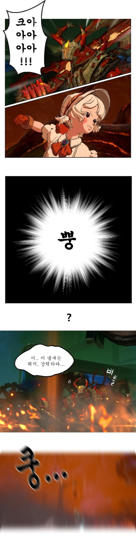 방두식: 솔직히 추첨 보상을 보고 조금 의욕이 생겨서 추억도 만들 겸 스토리가 있는 만화로 재밌게 만들어 보고 싶었습니다. 레이드 보스가 나왔을 때 최대한 안 죽으려고 열심히 피하며 원거리 공격을 하면서 여러 장을 찍었습니다. 잘 나온 사진만 골라서 편집 프로그램에 옮겨서 만화 형식으로 만들어봤습니다. 그 컷 중에 '꾸욱' 누르는 컷을 못 찍어서 직접 손을 그렸습니다.^^