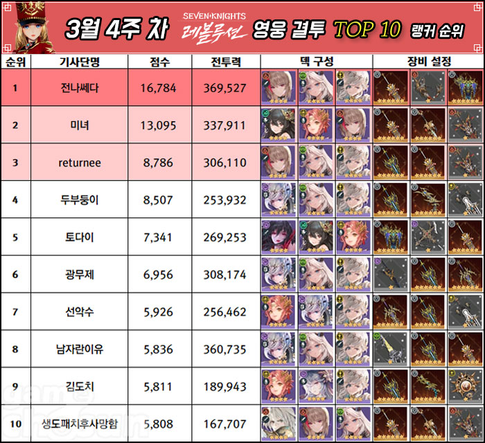 전나쎄다 유저가 3월 4주차에도 랭킹 1위를 유지하면서 2주 연속으로 영웅 결투 및 전투력 부문 2관왕에 올랐다. 이어서 2위는 미녀, 3위는 returnee(전 낫씽) 유저가 차지하면서 기존 순위를 이어갔다.