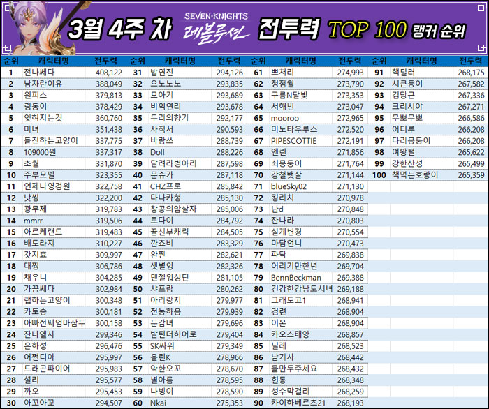 3월 4주차 전투력 랭킹 TOP 100의 평균 전투력은 290,086이며, 지난주 대비 4,415 가량 상승한 수치다.