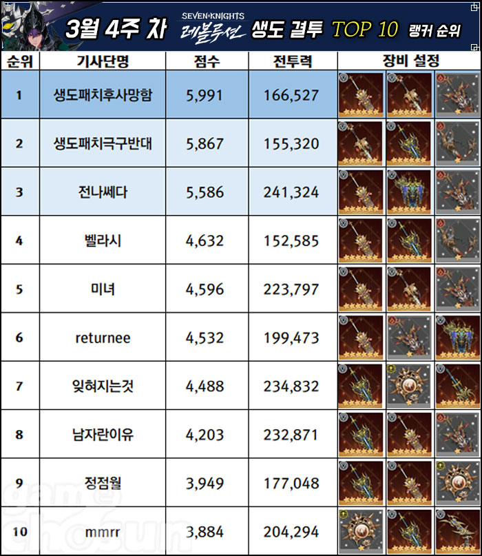3월 4주차는 각 부문별 순위 변동이 크게 발생하지 않았으며, 생도 결투 랭커들의 무기 조합도 크게 바뀌지 않은 모습이다. 영웅 결투 TOP10 내에서는 '순백의 기사 브란셀'의 픽률이 더욱 상승했으며, '악마의 화신 세인'과 '무신강림 린'의 픽률은 하락했다.