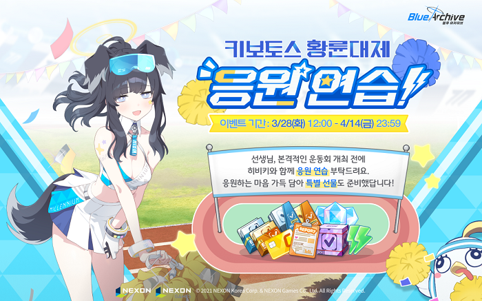 ‘키보토스 황륜대제’는 2년에 한 번씩 진행되는 대운동회로, 이번 이벤트 스토리에서는 개막식을 하루 앞둔 학생들이 예기치 못한 사고를 극복해나가는 이야기를 확인할 수 있다. 이와 함께 이벤트 전용 스케쥴 ‘스타디움’을 추가했다. 이벤트 스토리를 완료하고 포인트를 모아 ‘히비키(응원단)’의 엘레프 등 다양한 보상으로 교환할 수 있다.