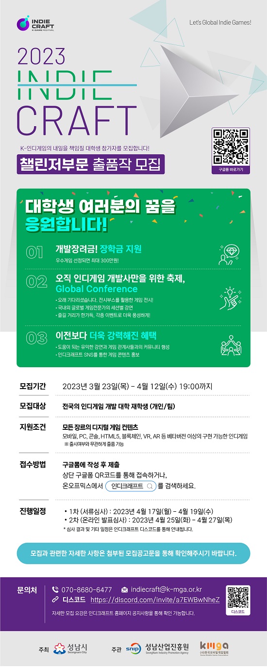한편 총 5억원 상당의 전시 맟 사업화 지원으로 글로벌 진출을 꿈꾸는 우수 인디게임 콘텐츠를 발굴하여 지속가능한 사업화 지원을 통해 글로벌 게임산업을 선도할 혁신적 게임을 육성하기 위해 시작한 인디게임 전시회 ‘2023 인디크래프트’는 5월 31일(수) ~ 6월 1일(목) 성남글로벌융합센터에서 이틀 간 전시부스와 함께 글로벌 컨퍼런스가 진행될 예정이다. 전시참여를 위한 출품신청은 4월 12일(수) 오후 7시까지 구글폼을 통해서 가능하다. 챌린저 모집에 대한 더 자세한 내용은 모임 전문사이트 온오프믹스에서 확인할 수 있다.