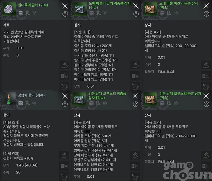 보스 귀중품 상자에선 별자리 연구 및 제작에 필요한 '아키움의 조각'과 '아키움의 결정', 스킬북 제작 등에 필요한 '에아나드의 잉크', 장비 강화에 필요한 강화 주문서와 마법 부여석을 얻을 수 있다. 공훈 상자에선 마을 용병 훈련관에게 구입하는 스킬북 교환 재화인 '델피나드의 별'을 얻을 수 있다.