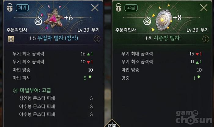 희귀 6강 무기와 고급 8강 무기의 스펙 차이 = 게임조선 촬영