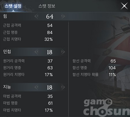전투선의 스탯은 캐릭터의 스탯과 비례한다. 함선의 공격력과 명중, 치명타 확률은 힘, 민첩 지능, 함선 최대 생명력과 생명력 자연 회복, 방어력은 체력, 함선 최대 활력과 활력 자연 회복, 기술 저항은 정신에 비례한다.