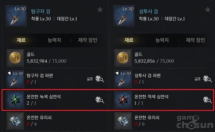 심연석은 검은칼 및 일일 의뢰에서 획득할 수 있는 재료로, 고급 등급 장비 제작에는 '흠이난 심연석(이하 고급 심연석)', 희귀 등급 장비 제작에는 '온전한 심연석(이하 희귀 심연석)'이 필요하다. 고급 심연석 10개를 모아서 희귀 심연석으로 제작이 가능하나, 제작 성공 확률이 단 10% 밖에 되지 않으므로 매우 부담이 된다. 또한 일일 의뢰도 희귀 심연석을 얻을 수 있는 주요 획득처이기는 하나, 희귀 심연석을 입수하는 확률이 낮은 편이다.