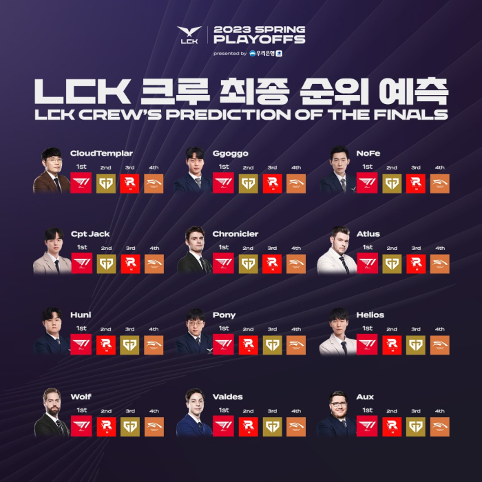 오는 8일과 9일 서울 잠실실내체육관에서 열리는 2023 LCK 스프링 최종 결승 진출전과 최종 결승전의 중계진과 분석 데스크 출연진도 확정됐다. 8일에는 전용준 캐스터와 '클라우드 템플러' 이현우, '포니' 임주완 해설위원이 최종 결승 진출전을 중계하며 9일 최종 결승전에서는 임주완 해설 대신 '노페' 정노철 해설위원이 참가, '전클' 듀오와 호흡을 맞춘다.