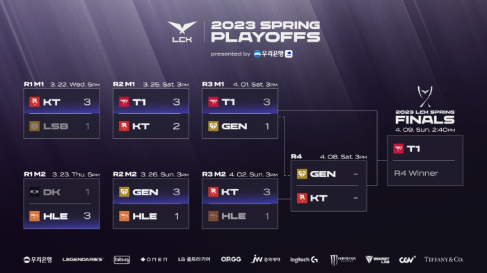 최종 결승전에 선착한 팀은 T1이다. 2023 LCK 스프링 정규 리그에서 17승1패, 세트 득실 +27을 기록하면서 1위를 차지한 T1은 플레이오프 2라운드에서 KT 롤스터를 3대2로 꺾은 뒤 3라운드에서는 젠지를 3 대 1로 잡아내면서 최종 결승전에 직행했다.