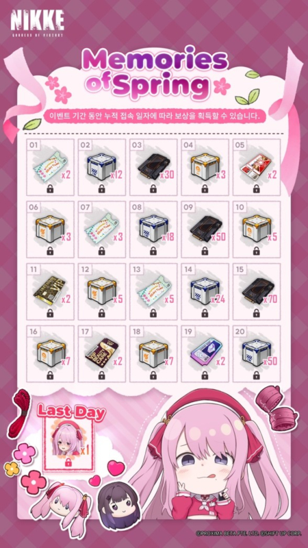 이번 업데이트를 기념해 오는 13일까지 ‘사쿠라’와 지휘관이 함께 가짜 핑크빛 약혼식을 꾸미는 ‘CHERRY BLOSSOM’ 이벤트 스테이지가 열린다. 또한 7일 누적 로그인만 해도 풍성한 보상을 얻을 수 있는 출석 이벤트와 21 Days Login이 동시에 진행된다.