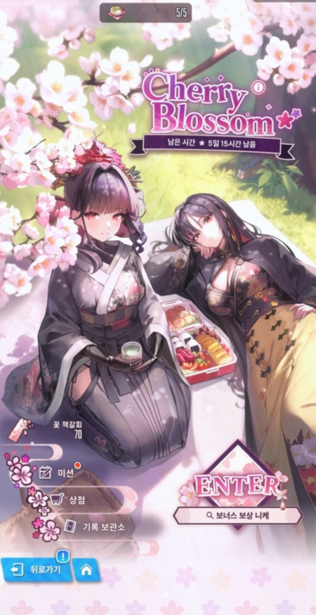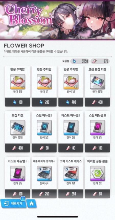 스토리 이벤트는 4월 13일까지 진행되며, 이벤트 스테이지를 클리어하면 이벤트 재화 ‘꽃 책갈피’를 획득할 수 있다. 이를 모아 이벤트 상점 ‘플라워 샵’에서 고급 모집 티켓 10장과 일반 모집 티켓 10장, 이외 다양한 육성 재료로 교환할 수 있다. 또한 스테이지에 입장할 수 있는 ‘벚꽃 주먹밥’을 구매할 수도 있다.