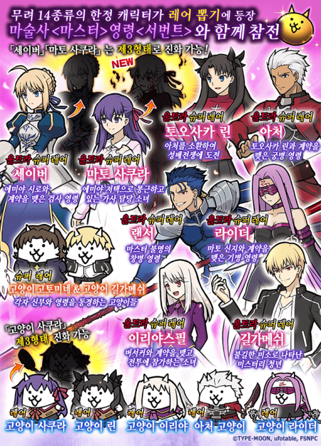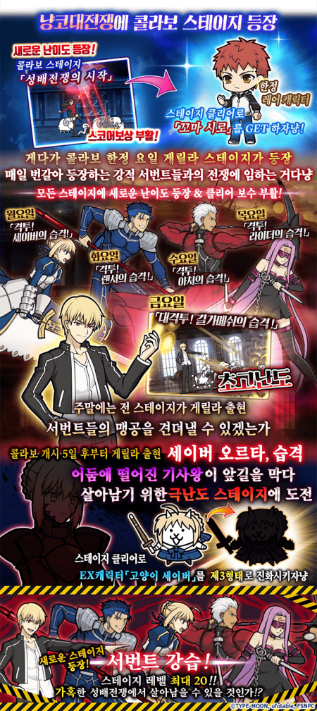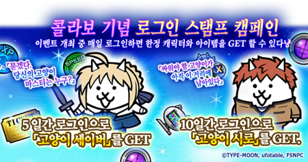 이벤트 기간 중 로그인하면 하루에 한 개씩 다양한 아이템을 받을 수 있으며, 5일간 로그인하면 콜라보 한정 EX캐릭터 ‘고양이 세이버’를, 10일간 로그인하면 콜라보 한정 EX캐릭터 ‘고양이 시로’를 획득할 수 있다.
