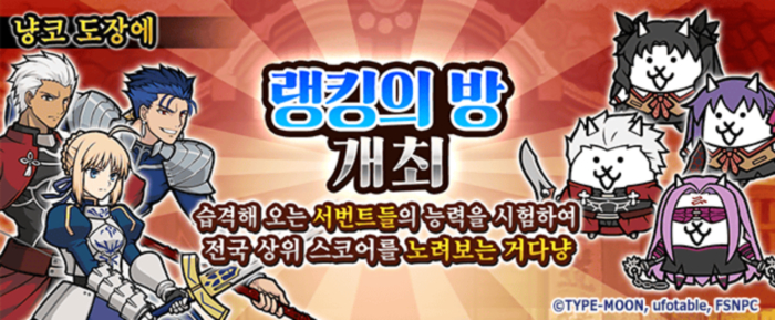 냥코 도장 ‘랭킹의 방’에 기간 한정 랭킹 이벤트로 ’Fate/stay night [Heaven's Feel]’의 캐릭터가 적으로 등장하는 ‘난투! 서번트 대습격!’이 개최된다.