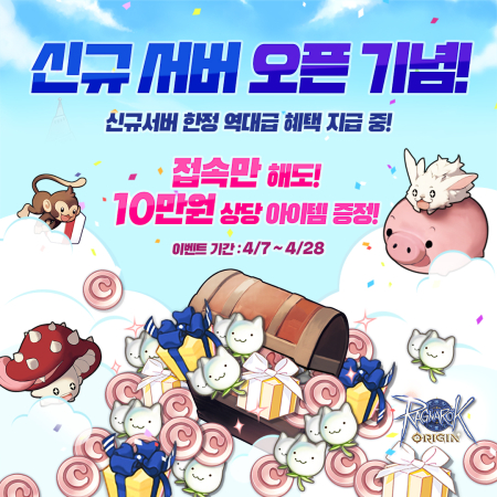 신규 서버에서 게임을 재미있게 플레이할 수 있도록 오픈 기념 이벤트 11종도 준비했다. 우선 4월 7일부터 28일까지 니플헤임 서버 내 최고 레벨 달성 유저 전원에게 한정 칭호, 냥다래, 고급 카드 자판기 등을 지급한다. ‘엔들리스타워 10층 클리어 이벤트’와 ‘매일 출석 이벤트’도 함께 진행한다.