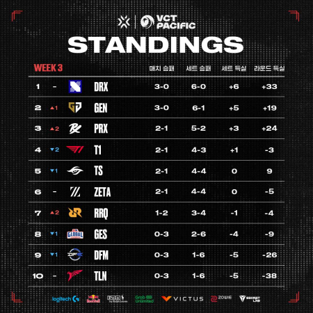 무실 세트 행진을 이어가고 있는 DRX는 세트 득실 +6으로 3주 연속 1위를 차지했다. DRX와 함께 3연승을 이어가고 있는 젠지는 세트 득실 +5를 기록하며 2위에 자리했고 T1은 한국 팀으로는 첫 패배를 당하며 2승1패, 4위로 내려갔다.