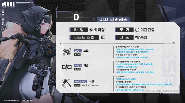 신규 업데이트 ‘License to Kill’에서는 스쿼드 시지 패러리스 소속의 새로운 SSR 캐릭터 ‘D’를 만나볼 수 있다.