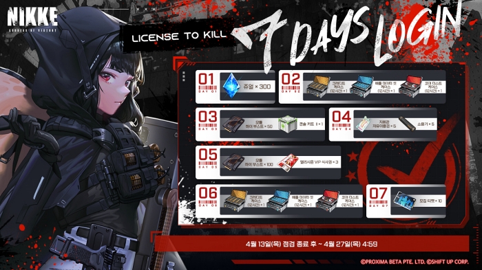 같은 기간 7일 간 누적 출석 이벤트를 실시하고, 게임에 접속만 해도 쥬얼, 크레디트 12H, 모듈 하이 부스트, SSR 호감도 아이템, 일반 모집 티켓 10장 등 풍성한 혜택을 선물한다.