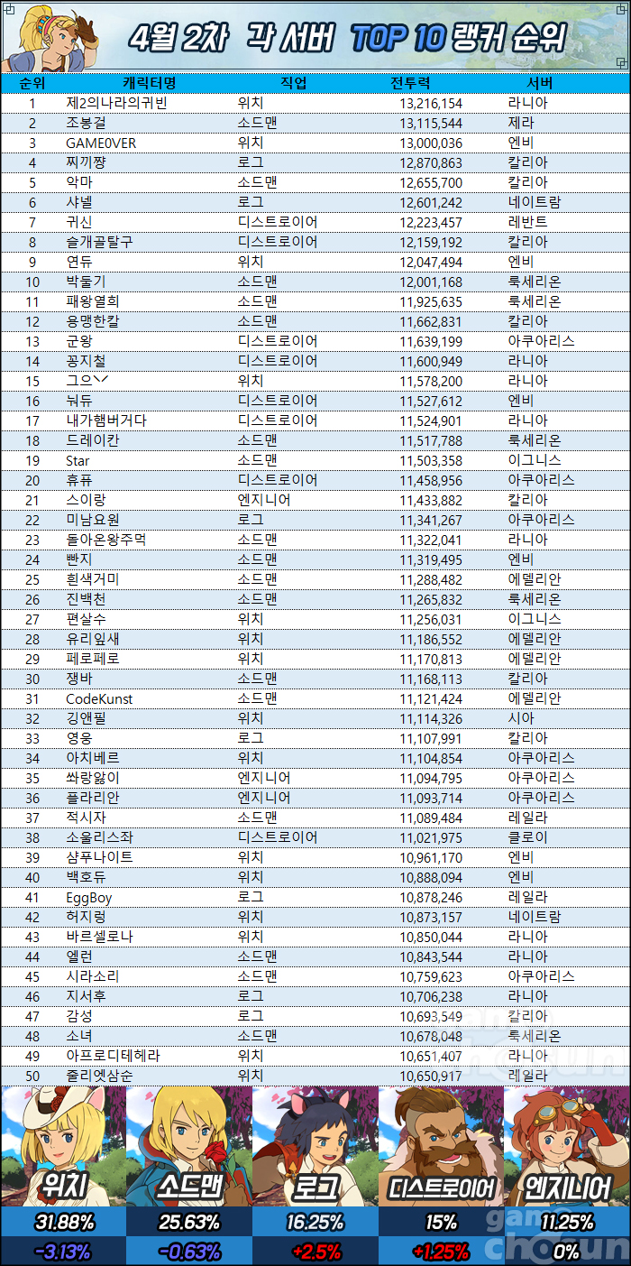 - 집계는 19일 10시부터 약 1시간 동안 실시됐으며, 누적 랭킹 메뉴의 캐릭터 전체 랭킹 항목을 기준으로 각 서버 상위 10명까지 선별했습니다. 집계 시간 동안 랭커들의 활동에 따라 전투력 및 직업에 오차가 발생할 수 있습니다.