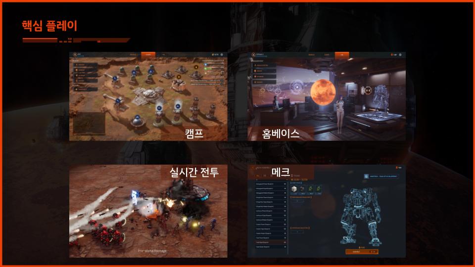 신해성 PD는 실제 게임 플레이를 예시로 게임을 설명했다. 우선 자원을 수집하는 캠프, 전력을 생산하는 홈베이스, 그리고 실시간 전투로 구성되며, 모든 것은 메크를 중심으로 진행된다. 캠프는 채굴과 테라포밍을 시작하는 생산 거점이다. 홈베이스에선 메크 조립과 기술 연구가 이루어지며, 생산을 담당하는 중요 거점이다. 이곳에선 여성형 안드로이드 부관이 유저인 개척자를 서포트할 예정이다.