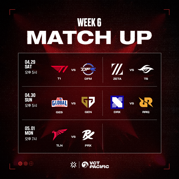 VCT 퍼시픽의 정규 리그는 주말 오후 4시 30분, 월요일 오후 6시 30분에 방송을 시작하며 경기 시작은 주말 오후 5시, 월요일 오후 7시다.