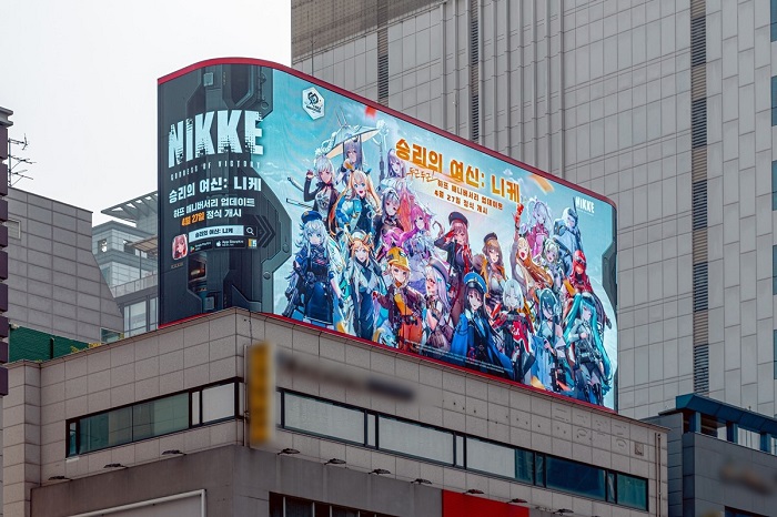 홍대역 주변에 위치한 대형 전광판은 서울 망원동에서 개최되는 ‘승리의 여신: 니케’ 메이드 카페를 찾는 방문객들의 눈길을 사로잡았다.