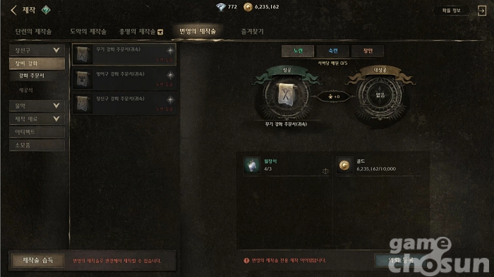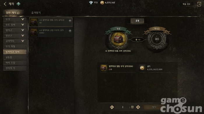 제작의 경우는 제작술을 '번영의 제작술'로 선택했을 경우에만 제작이 가능하다. 월장석과 약간의 골드를 재료로 매일 정해진 횟수만큼 무기, 방어구, 장신구 강화 주문서와 세공석을 제작할 수 있다. 밤까마귀 강화 주문서는 오로지 유료 상품으로만 판매하며 앞서 설명한 대로 4강 수준까진 장비 선택 상자를 모아 제작하는 것이 더 이득인 만큼 습득과 사용처가 다소 한정되어 있다.