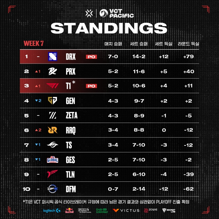 지난 6주 차에도 전승 행진을 이어가며 가장 먼저 플레이오프 진출을 확정 지은 DRX는 7주 차에서 만난 데토네이션 포커스미(일본)와의 한일전을 승리하며 한국 팀의 '한일전' 4연승을 이어갔다.