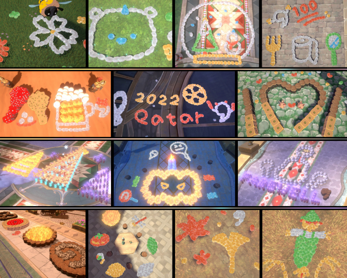 꽃나링: 오랫동안 찜해두었던 장소인 프리츠몰 손바닥 조형물에서의 일출 조경, 크리스마스 덕분에 화려해진 에스타바니아 남문에서의 크리스마스 조경, 우리나라 축구팀을 응원하는 치맥 조경, 가만히만 있어도 이쁜 마녀의 숲에서의 캔디샵 조경 등등 많지만, 제 기준으로 가장 기억에 남는 조경은 조경 초반부터 생각만 했었던 '행운의 후냐' 컨셉 조경이에요. 행운의 후냐에서 볼 수 있는 동산, 나무, 집 등을 조경으로 만들고, 조경팀원들은 후냐옷 입고, 행운의 후냐를 저희 쉼표 조경팀만의 방식으로 재해석하여 조경으로 표현해 볼 수 있었던 것이 가장 기억에 남아요! 후냐 옷이 생겼기 때문에 실현할 수 있었던 조경이었어요!