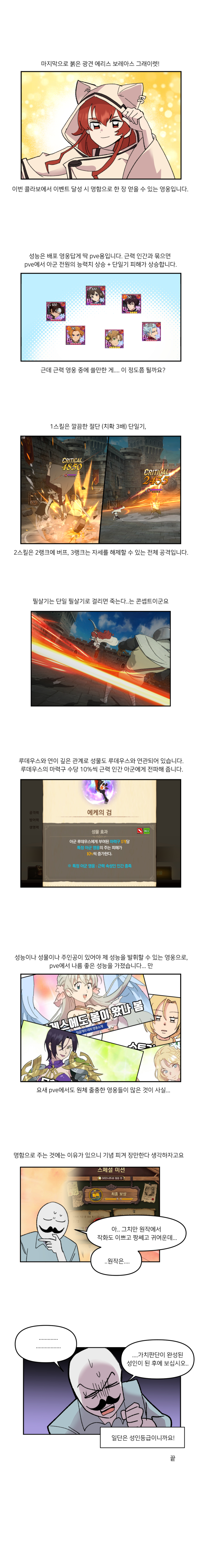 에리스는 기본적으로 PVE에 특화된 개성을 가지고 있다. 다만 그 기준이 근력 영웅들로만 한정돼는데다 성물의 경우 남편인 루데우스만 영향을 주기 때문에 사용이 까다로운 편. 게다가 PVE 특화 영웅은 에리스를 제외하고도 많기 때문에 아주 유용하게 사용하기엔 다소 무리가 있다.
