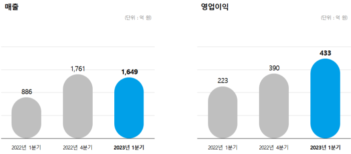 그라비티의 2023년 1분기 매출은 1,649억 원, 영업이익은 433억 원으로 전년 동분기 대비 각각 86.2%, 94.1% 증가하며 상승세를 이어 나가고 있다. 전분기 대비 매출이 소폭 감소한 반면, 전분기 대비 영업이익은 11.1% 증가하며 영업이익 부분에서는 계속 증가세를 유지 중이다.