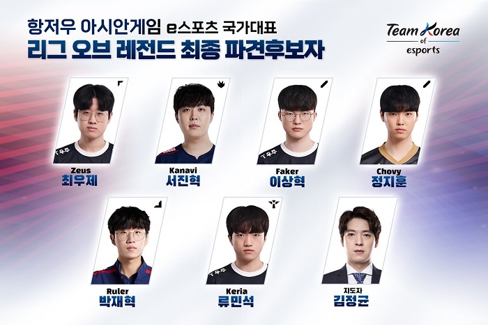 LoL 종목 파견후보자는 ▲’제우스’ 최우제(T1) ▲’카나비’ 서진혁(징동 게이밍) ▲’페이커’ 이상혁(T1) ▲’쵸비’ 정지훈(젠지 e스포츠) ▲‘룰러’ 박재혁(징동 게이밍) ▲’케리아’ 류민석(T1)(포지션별-가나다순) 이상 6인이다.