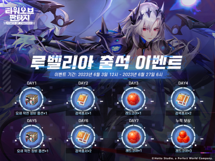 이번 루벨리아의 출시를 기념하여 출석 이벤트도 진행한다. 이벤트 기간 동안 7일을 접속하면 요새 작전 옵션 장비 옵션, 검색증서와 레드코어 등 출석 보상과 누적 보상을 획득할 수 있다.
