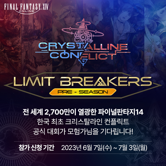 ‘크리스탈라인 컨플릭트 리미트 브레이커스 프리시즌’은 지난 V6.1 ‘새로운 모험’에 도입되어 새롭게 선보인 5 대 5 PvP 콘텐츠 ‘크리스탈라인 컨플릭트’의 한국 첫 공식 대회다. 해당 대회 명칭인 ‘리미트 브레이커스’는 직업별 강렬한 기술 ‘리미트 브레이크’를 활용해, 한계를 초월한 도전을 통해 승리를 쟁취하는 한국 모험가들의 경쟁의 의미를 담고 있다.