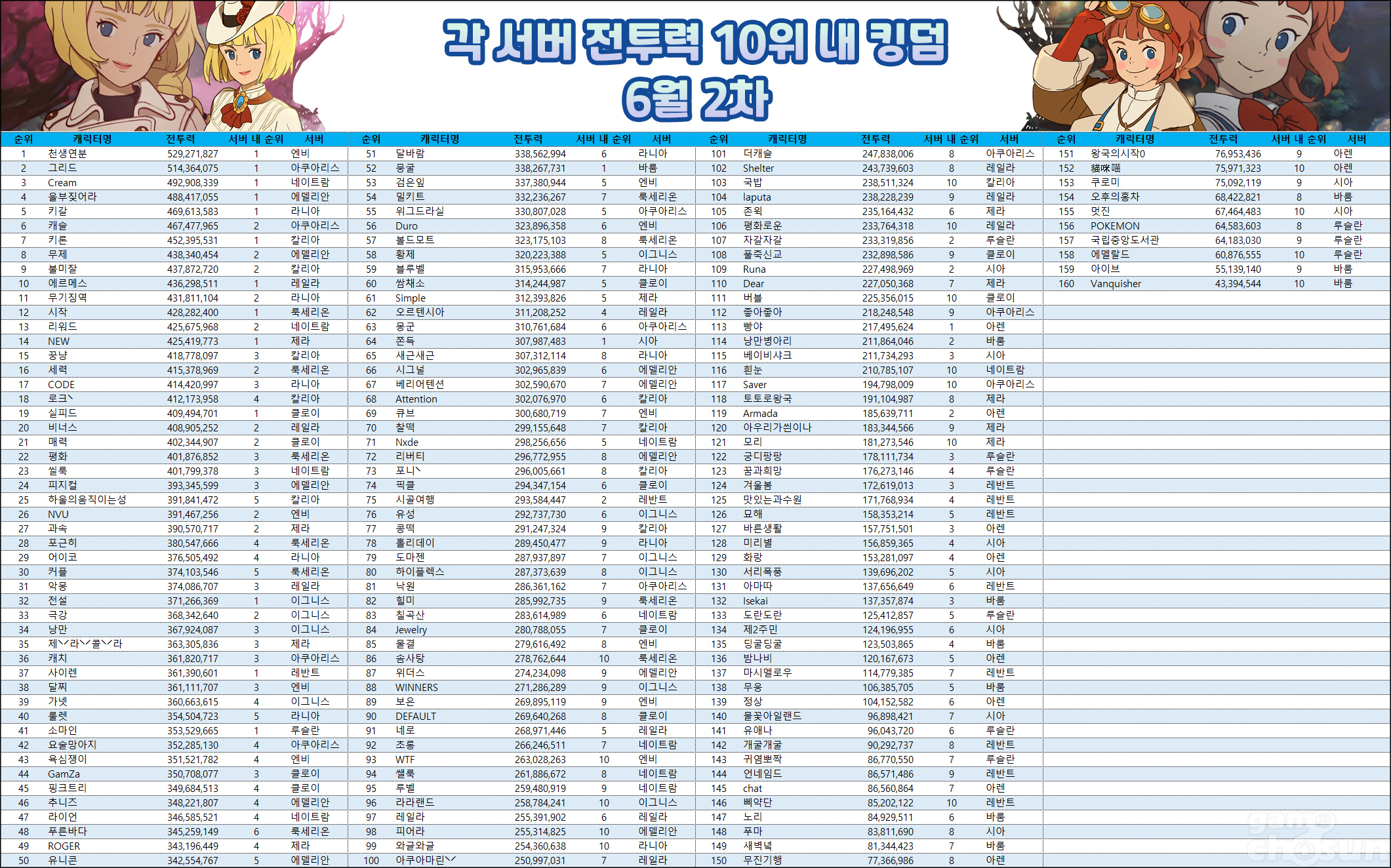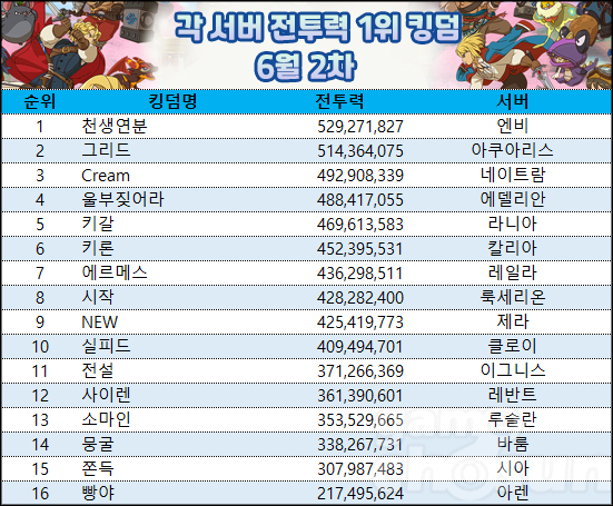 각 서버 1위 킹덤 중 전투력이 가장 높은 킹덤은 전투력 529,271,827을 달성한 엔비 서버 '천생연분' 킹덤이다. 지난 랭킹 대비 24,705,284 상승했으며, 2위 아쿠아리스 서버 '그리드' 킹덤과 전투력 차이는 14,907,752다. 그리드 킹덤은 비록 1위 도전에 실패했지만, 천생연분과 함께 5억 킹덤으로 이름을 떨치고 있다.