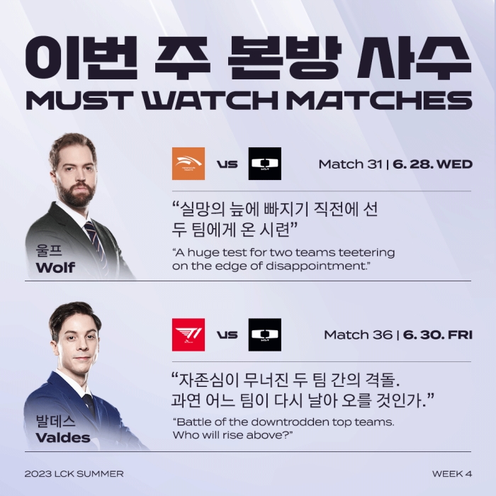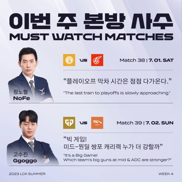'노페' 정노철 해설위원은 "플레이오프 막차 시간은 점점 다가온다"라며 7월 1일(토) 열리는 리브 샌드박스와 광동 프릭스 경기를 이번 주의 매치업으로 추천했다. 3승3패인 광동 프릭스와 2승4패인 리브 샌드박스가 6위 자리를 두고 대결하기 때문이다. '꼬꼬갓' 고수진 해설위원은 7월 2일(일) 열리는 젠지와 한화생명e스포츠 경기를 선택했다. 각 팀 승리의 주역이라고 할 수 있는 미드 라이너인 '쵸비' 정지훈과 '제카' 김건우, 원거리 딜러 '페이즈' 김수환과 '바이퍼' 박도현의 맞대결 결과에 따라 승부가 결정될 것으로 전망했다.