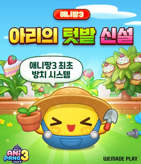 [자료제공 = 위메이드플레이] 위메이드플레이(대표 이호대)는 모바일 퍼즐 게임 '애니팡3'에 방치형 콘텐츠 '아리의 텃밭'을 선보인다고 28일 밝혔다.
