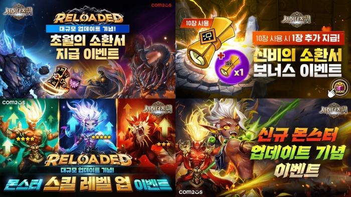 컴투스는 업데이트를 기념해 7월 30일까지 다양한 이벤트도 실시한다. 미션을 클리어하고 별의 조각을 모으면 누적 획득 수에 따라 초월의 소환서, 찬란한 소환의 축복 등을 지급한다. 새롭게 등장한 던전을 클리어 하고 태생 5성 몬스터를 1회 소환하면, 데빌몬, 신비의 소환서 등의 보너스 선물도 받아볼 수 있다.