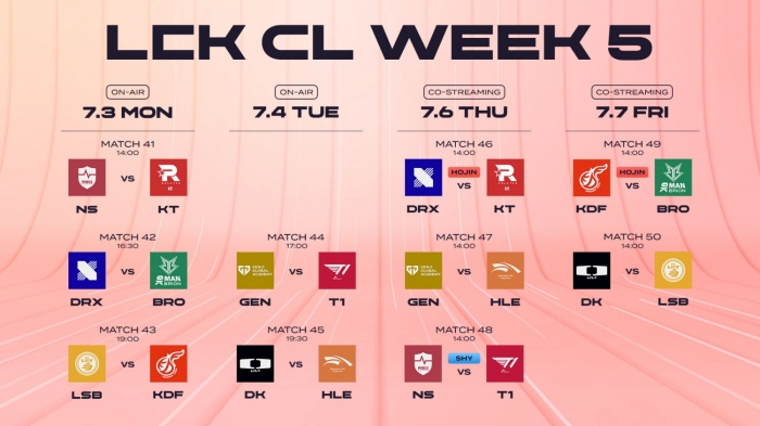 5주차 경기는 3일(월) 오후 2시 농심 이스포츠 아카데미와 kt 롤스터의 경기로 시작한다. 두 팀의 통산 상대 전적은 8대 7로 팽팽한 상황이다. 상위권으로 치고 나가야 하는 중요한 시기에 만난 두 팀 중 어느 팀이 승리하게 될지 관심이 집중된다. 이어서 DRX와 OK저축은행 브리온, 리브 샌드박스 유스와 광동 프릭스가 맞붙는다. 4일(화)에는 오후 5시부터 젠지 글로벌 아카데미와 T1 e스포츠 아카데미가 맞붙고, 현재 순위 1위인 디플러스 기아와 2위인 한화생명e스포츠가 대결한다.