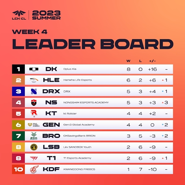 지난 4주차에는 디플러스 기아가 8경기 16세트 전승을 이어가며 단독 1위를 유지하고 있는 가운데, 한화생명e스포츠가 6연승을 달리면서 뒤를 쫓고 있다. 그다음으로 DRX, 농심 이스포츠 아카데미, kt 롤스터, 젠지 글로벌 아카데미가 치열한 중위권 싸움을 이어가고 있으며, 광동 프릭스는 절실했던 첫 승을 신고했다.