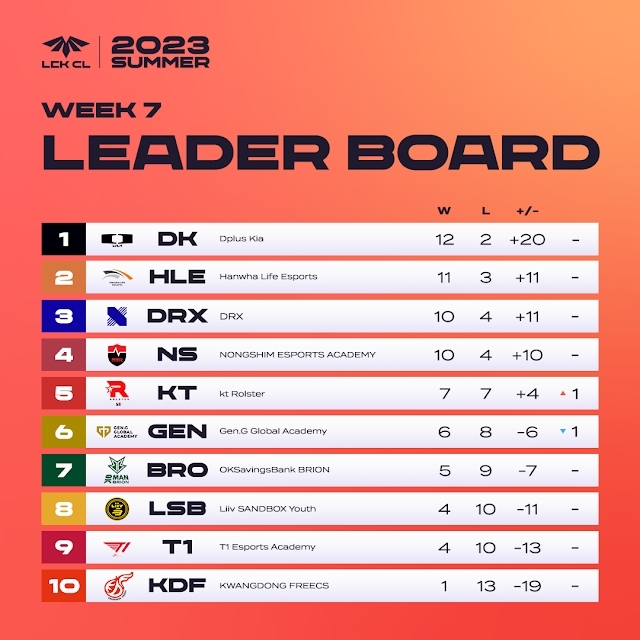 지난 7주차까지 마무리된 결과 디플러스 기아가 2패를 기록하며 연승을 마감했지만, 여전히 1위 자리를 지키고 있다. 그 뒤를 한화생명e스포츠와 DRX가 무서운 기세로 쫓고 있으며, 농심 이스포츠 아카데미 또한 3연승으로 4위 자리를 유지하고 있다. 그다음 kt 롤스터, 젠지 글로벌 아카데미가 그 뒤를 잇고 있다.