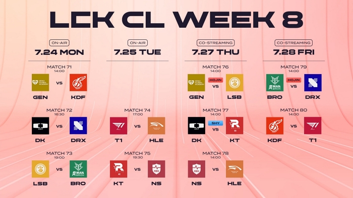 8주차 경기는 24일(월) 오후 2시 젠지 글로벌 아카데미와 광동 프릭스의 경기로 시작한다. 두 팀의 통산 상대 전적은 매치 11 대 5로 젠지 글로벌 아카데미가 우세하다. 두 팀 모두 최근 연패를 기록하고 있는 승리가 절실한 상황에서, 어느 팀이 소중한 1승을 가져갈 수 있을지 관심이 주목된다.