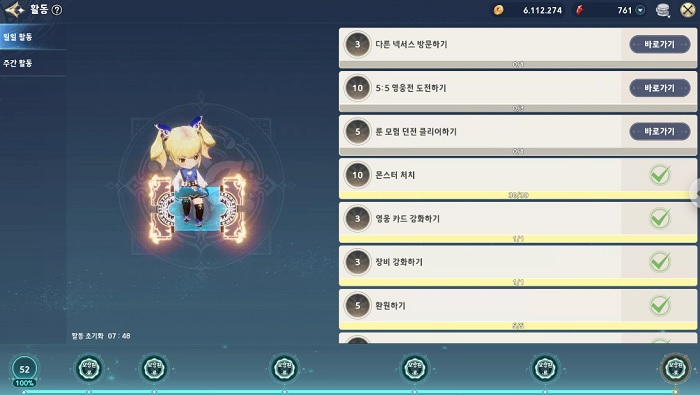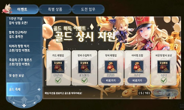 위에서 소개한 도전 콘텐츠 및 PvP 콘텐츠 등을 플레이하면 일일 과제 및 골드 획득 이벤트의 과제 절반을 달성하게 되며, 추가적으로 장비 레벨업 및 아이템 조합, 영웅 카드 육성 등을 진행한다면 손쉽게 나머지 과제를 달성할 수 있다.