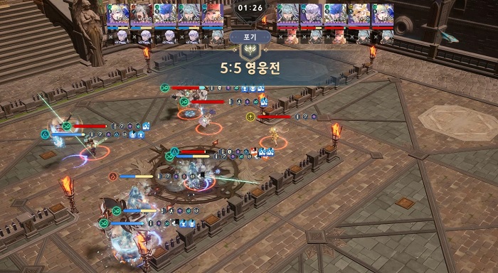 5:5 영웅전은 전투를 펼치는 영웅 5명과 지원 영웅 3명을 배치해 다른 이용자의 덱과 자동 전투를 진행하는 오토 결투 콘텐츠다. 자동으로 전투가 진행되고 연속 전투가 가능함에 따라, 부담이 없으며 10회 모두 플레이하기를 권장한다. 이곳에서 얻을 수 있는 5:5 섬멸의 증표는 영웅의 속성 마스터리에 투자해 영웅을 더욱 강하게 만드는 것이 가능하다.