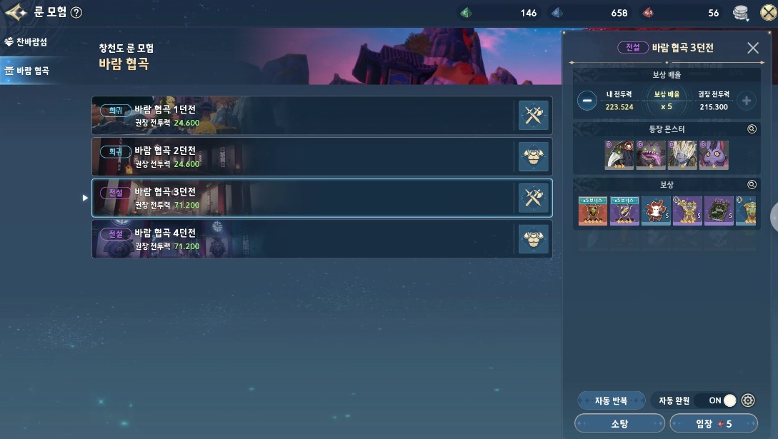 위에서 언급한 플레이 요소들을 모두 즐겼다면, 이제는 반복 콘텐츠 플레이를 통해 장비 파밍 및 육성 재료 획득을 해가면 된다. 우선 룬 모험은 그랑시드, 달빛의 섬, 창천도, 디트리아 등으로 나눠져 있으며 각 지역 룬 던전은 무기와 방어구를 획득할 수 있는 던전으로 구분돼 있다.